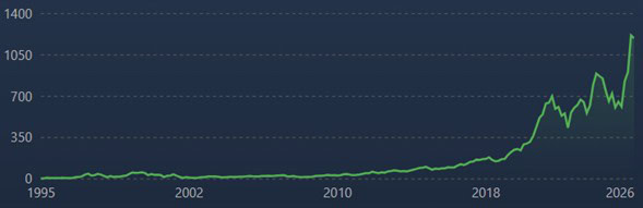 ASML’s stock has followed a strong long‑term upward trend, although recent years show increasing volatility.